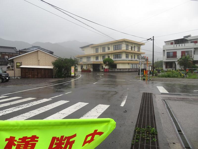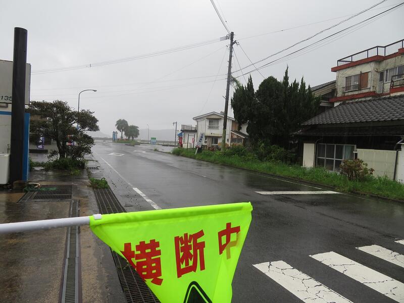 ↑古江港から走ってくるとこの横断歩道は見えやすいのですが、この写真側(北浦インター方面から東進)は、カーブの先、朝日側に横断歩道があって、見えにくいのです。