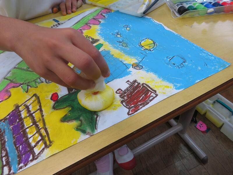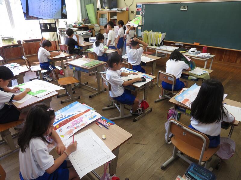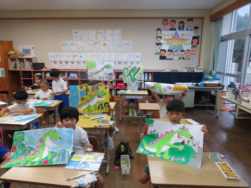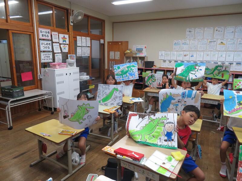 1時間目、2年生は図工の学習でした。「かいじゅうのすむしま」という本を読んでの感想画です。クーピー・クレヨン・絵の具・ガーゼや綿で作った秘密の道具を使って、かわいく色鮮やかな作品作りに一生懸命取り組んでいました。