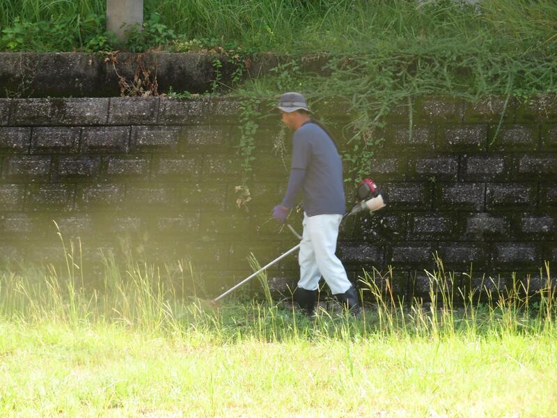 そんな中、広い運動場周辺の草刈りの支援に、延岡市教育委員会から技術指導員のお二人が来られました。刈っては伸びる草ですが、だいぶきれいになりました。
