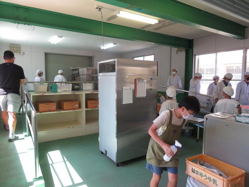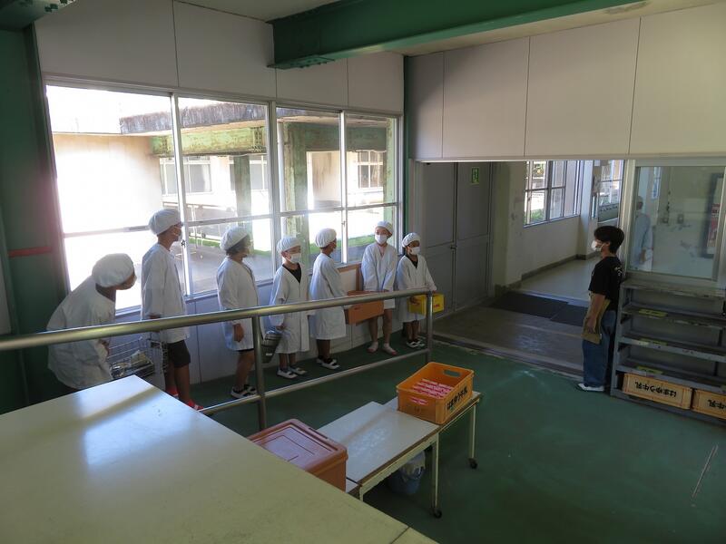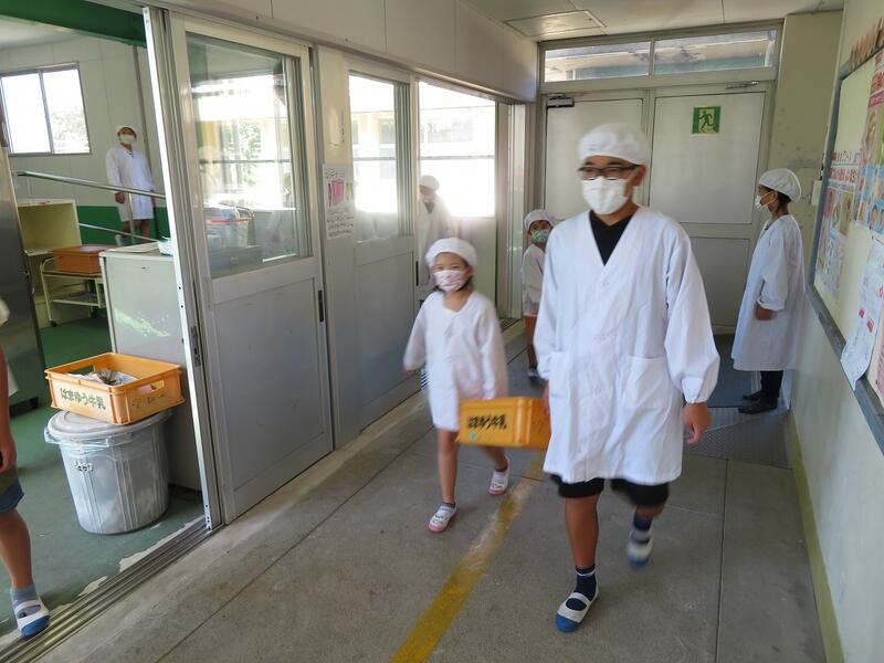↑いつも5・6年生の給食委員会児童や、栄養教諭、技術員の先生が受取り等のお世話をしてくれます。いつもありがとうございます。