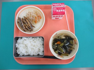 今日の献立は、ご飯、牛乳、きびなごのかりんとうがらめ、もやしそえ、すましじるです。