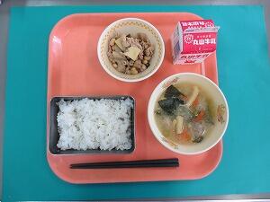 今日の献立は、ご飯、牛乳、五目まめ、ごぼうだんごじるです。
