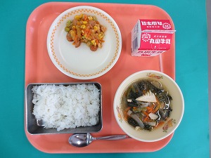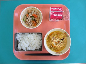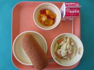 今日の献立は、ミルクパン、牛乳、とりにくのレモンあえ、コロコロやさいスープです。