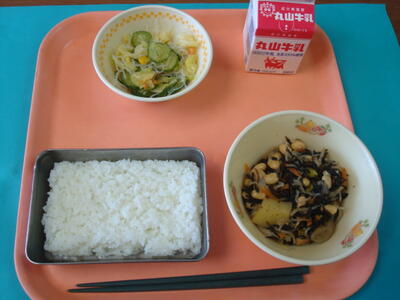↑ 今日の給食は、ごはん、牛乳、大豆の磯煮、春雨の酢の物でした。