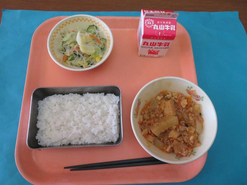 ↑ 今日の給食は、ごはん、牛乳、マーボー大根、春雨の酢の物 です。