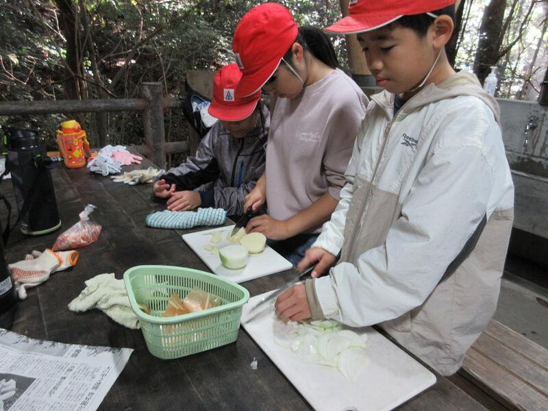 ↑ さて、午前中はみんなでカレーづくりです。役割分担をして、食材を切る係、火おこしをする係など、力を合わせておいしいカレーをつくっていきます。