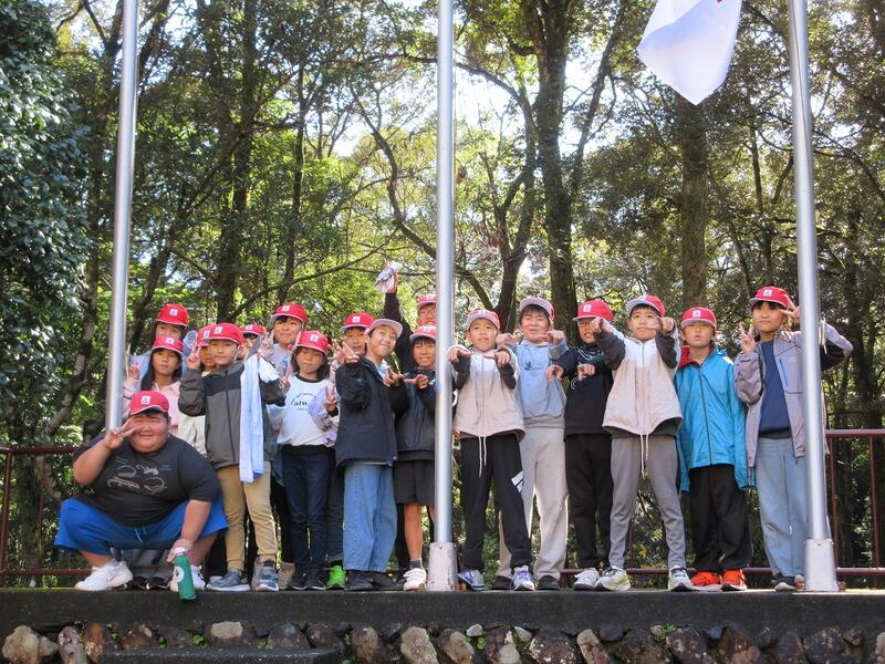 ↑ 楽しかった2日間も、あっという間に学校へ帰る時間となりました。最後に、1日目の山頂で撮る予定だった集合写真を撮りました。