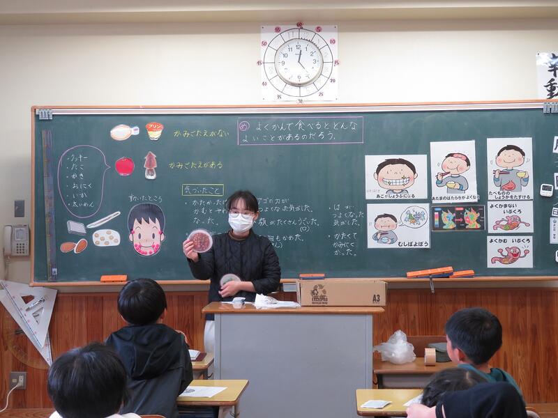 消化を助けたり、あごを丈夫にしたり、むし歯を予防したりと、様々な良いことがあることを学んだ2年生です。「今日からしっかりかんで食べます」と感想を言う子も多かったです。