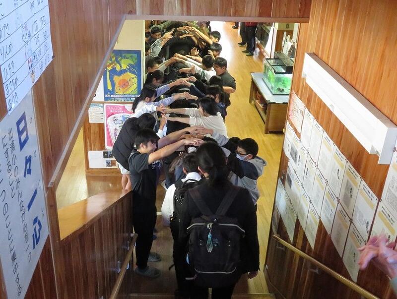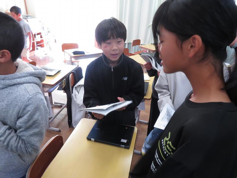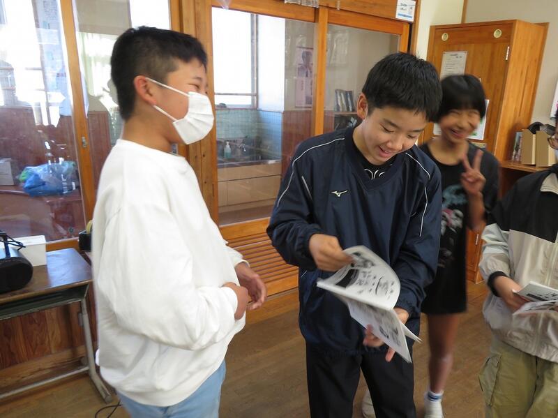 今日は1~4年生は遠足に行ってます。学校にいて学習をしているのは2階の5・6年生のみです。6年生は来週の木・金と大分に修学旅行に行きます。大分駅で通行人の方々に対しての北浦PR活動を行いますので、今日は6年生が説明役・通行人役に分かれてPR活動の練習を行っていました。