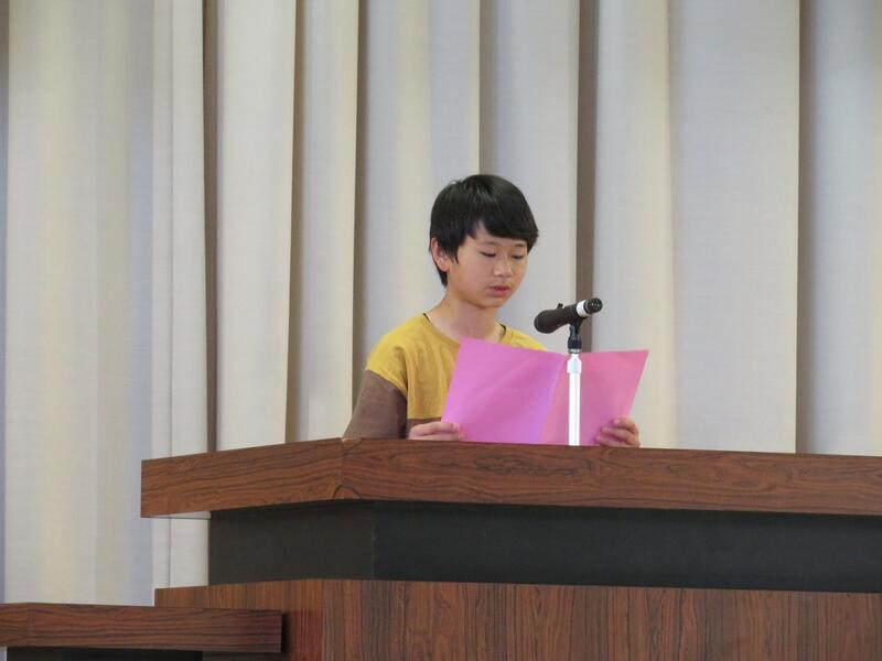 ↑3年生と5年生の代表児童が、1年間を振り返っての作文を読んでくれました。内容も読み方も素晴らしいものでした。