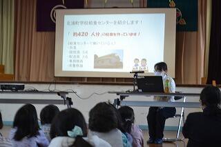 1月22日(木)に、給食感謝集会を行いました。当日は、栄養士の関口先生をお招きし、はじめに給食の歴史や栄養バランスの大切さについて、分かりやすく教えていただきました。その後、給食センターの職員の皆様が給食を作ってくださる様子を収めた映像を視聴しました。最後に、児童生徒を代表して生徒会長より、栄養士の関口先生に対して、おいしい給食をつくっていただいている感謝の気持ちを込めてお礼の言葉を伝えるとともに、児童生徒で作成したお礼の品をお渡ししました。日頃何気なく食べている給食が、多くの方々の努力と工夫によって支えられていることを改めて知り、児童生徒は、感謝の気持ちを深めることができました。