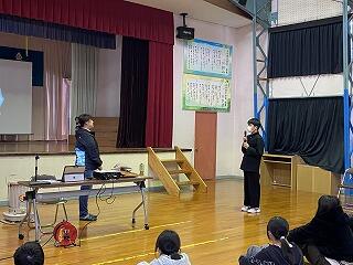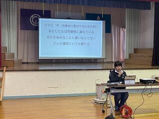 2月6日(金)の3校時に、ふるさと教育推進事業「子どもたちに伝えたいこと」として、講師に平野様をお招きし、ご講話いただきました。平野様は、お父様を亡くされたことをきっかけに「命」の尊さについて深く考えるようになったそうです。もともと動物が好きであったことから、犬や猫の殺処分という社会的な問題に目を向け、「自分にできることは何か」を考え、現在は動物愛護団体「Animal Buddy」を運営され、犬や猫の保護活動などを行われておられます。講話では、殺処分の現状や命と向き合うことの大切さについて、実体験を交えながら分かりやすくお話しいただきました。本校には自宅でペットを飼っている児童生徒も多く、身近な存在である動物の話題に、子どもたちは真剣な表情で耳を傾けていました。今回の学びは、単に「ペットを大切にしよう」ということにとどまらず、「人も動物もすべての命は同じ重さをもち、かけがえのない存在である」ということに気づく貴重な機会となりました。子どもたち一人一人が命について考え、自分の生き方や行動を見つめ直すきっかけとなる、意義深い時間となりました。