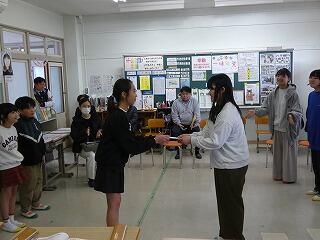 1月26日(月)児童登校後、スクールバス感謝集会を行いました。本校の児童生徒は、日頃スクールバスを利用して登下校しており、運転手の長友さんには大変お世話になっています。集会では、児童生徒が日頃の感謝の気持ちを改めて伝えることができました。児童生徒を代表して6年生児童が感謝の言葉を述べ、心を込めたお礼の品をお渡ししました。