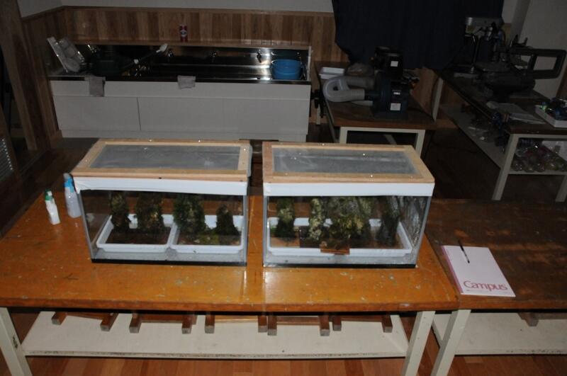 昨年度は、60cm水槽2台。クーラーが来るまでは、ペットボトルで作った氷を入れて水槽の