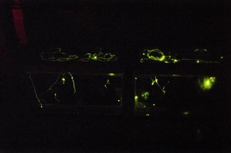 飼育箱にてゲンジボタルが飛んでいる様子