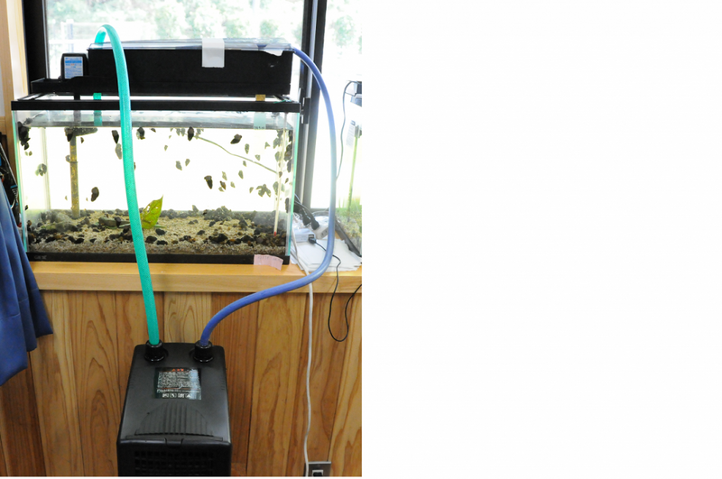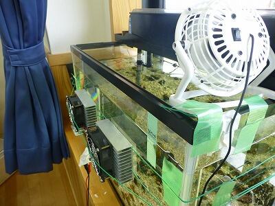 風を送ることでどのくらいの効果があるのか調べるために、2つの水槽のうち片方だけにファンを取り付けました。
