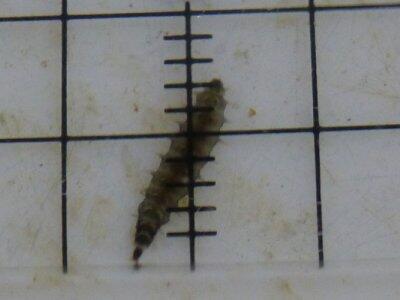 1円玉の上に2匹の幼虫がいる 間の黒い点はカワニナの稚貝