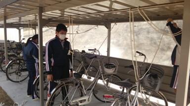 中学3年生が自転車小屋に自転車スタンディングロープをつけてくれました。