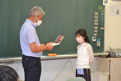 始業式では、上述した現状から今までとは異なる全校放送での実施となりましたが、落ち着いた様子で児童生徒代表あいさつや校長先生のお話に耳を傾ける姿が、ひと夏の成長を物語っていました。代表あいさつでは、小学4年生代表児童が、みんなを元気づけるかのような大きな声で①忘れ物をしない②授業に集中する③文化発表会で下学年のお手本となる発表をすると目標を掲げ、稲刈り等を楽しみにしている気持ちを発表してくれました。校長先生からは、夏休み中に実施された青少年の主張宮崎県大会において優秀賞を受賞した小野杏実さん(中学部2年生)の活躍と成長について、「何かを学ぶためには、自分で体験する以上にいい方法はない(独 アルベルト・アインシュタイン)」の名言と併せてお話があり、夢に向かいチャレンジする児童生徒の姿を望まれました。