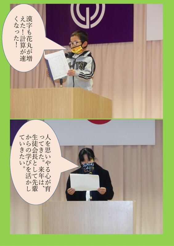 始業式での代表挨拶は、小学部4年生が新年の目標について「失敗しても、できなくても、諦めずに努力し、七転び八起きの考えで頑張り続ける年にしたい。」と素晴らしい発表をしてくれました。最後に集合写真を撮影したので、一部を掲載します。