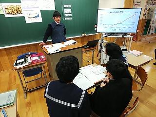 中学1年の学級で、社会科の研究授業を行いました。提示された資料を基に生徒が自ら問題を設定し、複数の資料を活用しながら考察したことを、自分たちのことばでまとめる授業でした。これから求められる主体的で対話的な学習ができていました。