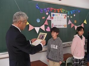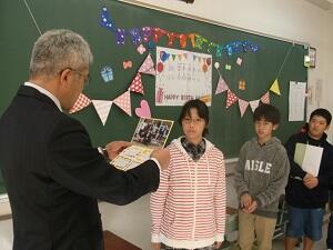 集会に先立って、県の英単語コンテスト、読書感想文コンクール、BFC防火作品展の入賞者の伝達表彰を行いました。