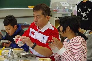 今回は、給食時間から入っていただき、一緒に給食を食べていただきました。その後、歯の磨き方を指導していただきながら、食後の歯磨きをしました。