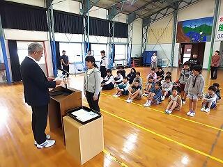 まず、体力テストでA判定をもらった児童・生徒(5名)に表彰状が渡されました。次に、卓球大会の優勝・準優勝の生徒と、サイエンスコンクールの最優秀賞の生徒達に、表彰状が渡されました。