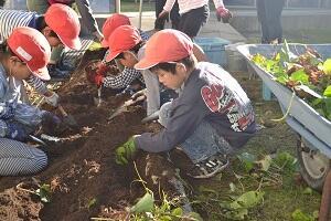 小学部1・2年生がいも掘りをしました。わずかたたみ1畳ぐらいの広さから、なんとサツマイモが70個以上とれました。いもを見つけては、せっせと掘り、満面の笑顔を見せてくれました。収穫する喜びを味わったひとときでした。