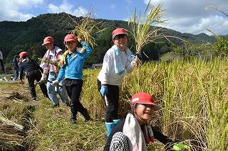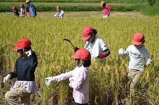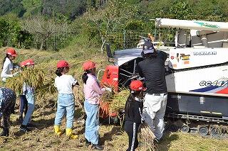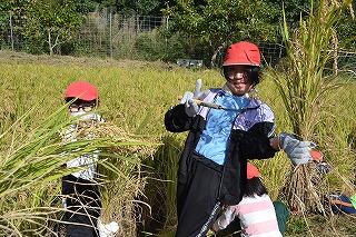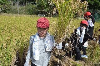 10月10日(金)、小学部で内田さんの田んぼをお借りして稲刈りが行われました。秋晴れのもと、児童は張り切って稲刈りに取り組み、笑顔あふれる表情がとても印象的でした。児童による稲刈りの後には、内田さんが大きなコンバインで仕上げの稲刈りを行い、児童たちが刈った稲を脱穀してくださいました。