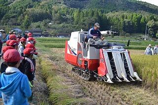 【稲刈り楽しい!コンバインすご~い!内田さんと保護者の皆様のご協力を得ながら稲刈りがどんどん進みました。】