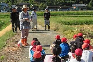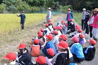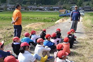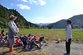 【はじめの会の様子です。5年生の甲斐心優さんがはじめの言葉を述べ、田んぼを貸してくださっている内田さんからご挨拶をいただきました。保護者の今井さんからは、稲の刈り方について説明がありました。】