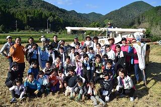 【終わりの会では、12年間田んぼを貸してくださった内田さんからご挨拶をいただき、児童・職員・保護者の皆様の温かい拍手に包まれました。6年生の甲斐穂乃花さんが感謝の言葉を述べ、最後にみんなで記念撮影。楽しかった稲刈りの行事を締めくくりました。】