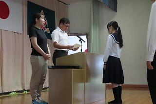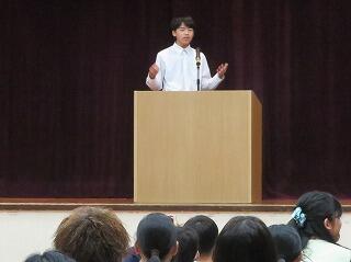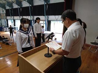 その後の任命式では、校長先生より生徒会長に任命書が手渡されました。新生徒会長は、「当たり前のことを、当たり前にできる学校づくりを進めていきたい。そのために、みなさん一人ひとりの力を貸してください」と、力強い決意を語ってくれました。