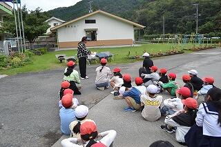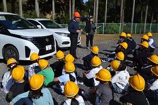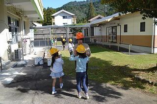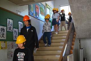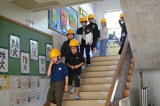 低学年の児童は慣れないヘルメットに少し戸惑う様子も見られましたが、先生の指示をよく聞き、しっかりと着用して安全に避難することができました。