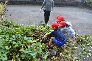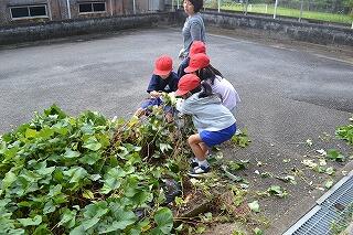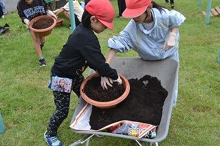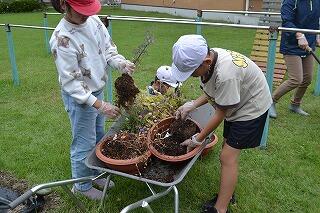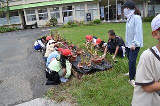 10月23日(木)、全校で「にこにこ緑活動」を行いました。今回は、一人一鉢の花を植え替えるための準備として、土作りに取り組みました。子どもたちは、枯れかかっている花を丁寧に抜き取り、両手三杯分の肥料を鉢の土に加えて、かたくなった土をほぐしていきました。土の感触を楽しみながら、友達と声をかけ合い、協力して作業を進める姿があちこちで見られました。きれいに整った鉢を見て、「早く新しい花を植えたいね」と笑顔を見せる児童もいました。12月には、いよいよ新しい苗を植える予定です。子どもたちが心を込めて育てる花で、校内がさらに明るく彩られることでしょう。