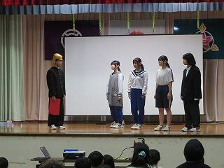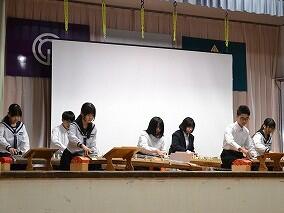 【↑中学部 英語暗唱「The Three Dolls」、琴演奏「荒城の月」「さくら変奏曲」】