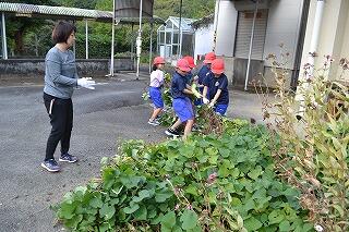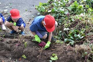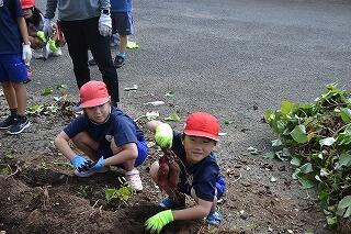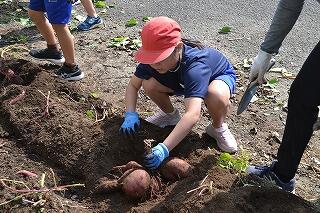 10月28日(火)、小学部1・2年生でお芋掘りを行いました。「どんなお芋が土から出てくるだろう?」と、みんなわくわく・どきどきしながら掘り始めました。ところが、このお芋がなかなか手強い!土の中にしっかりと根を張っていて、簡単には抜けません。子どもたちは夢中になって土を掘り、つたを引っ張り、ようやく大きなお芋が「こんにちは!」 土の中からお芋が出てきた瞬間、みんな大喜びでした。