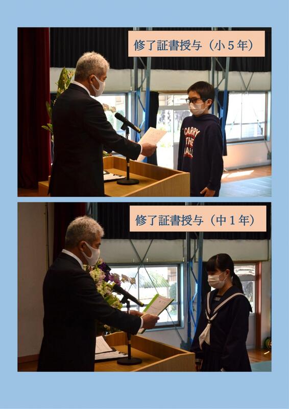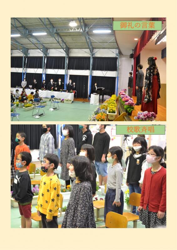 学校長より、小学1年生は「返事をする」「自分のことは自分でできるようになる」「お友達となかよくする」の3つのお願い、中学1年生は自分の心と体、友達の心を大切にし自分の可能性を広げてほしいと、お祝いのことばを頂きました。