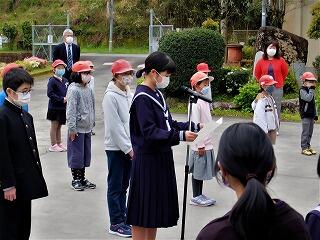 入学式に在校生が出席できなかったので、小学部・中学部の新1年生と在校生の顔合わせを行いました。少しでも3密を避けるために、屋外で間隔を開けて行いました。