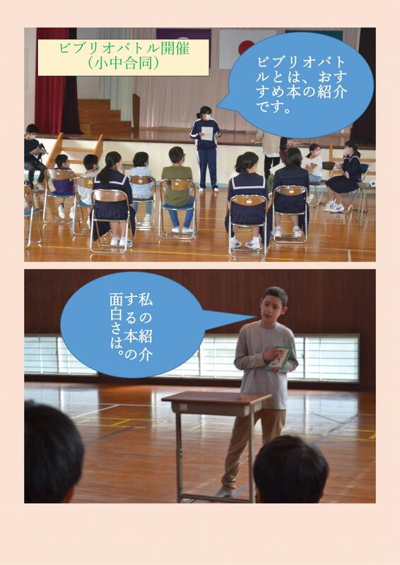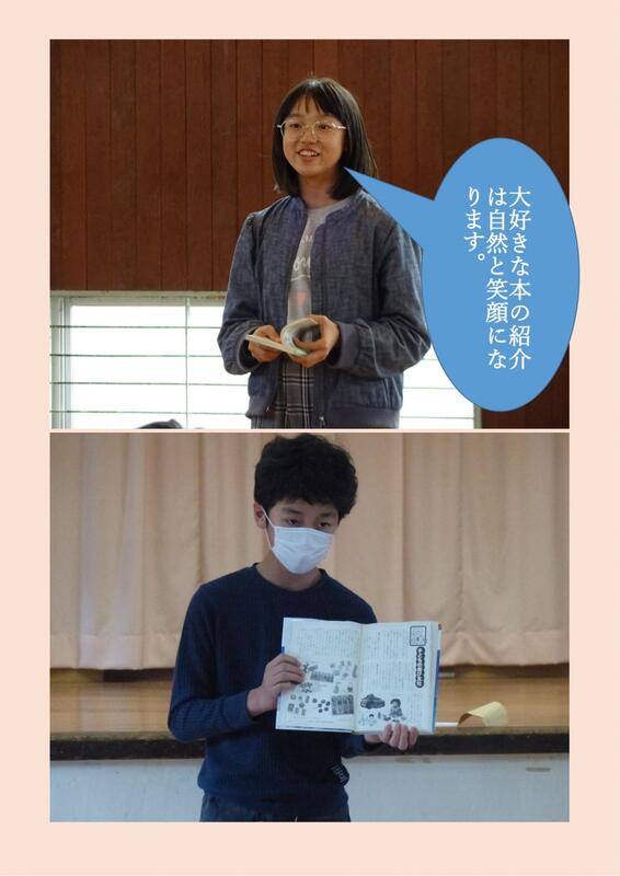 自分の好きな本(ジャンルは問いません)を聞き手が読んでみたいと思わせる事を競いますが、話しすぎてもあらすじがわかってしまい、言葉が足りなくて面白さが伝わりにくい等、簡単そうで難しいものです。しかし、自分の好きな本を紹介する姿は表現力豊かに手振り身振りも加わり、自信あふれる言葉遣いや態度はとても面白く充実した昼休みとなりました。代表の児童生徒の写真を掲載します。