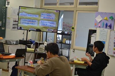 本校では職員のICTチームを立ち上げICTを活用する授業改善を目指し、その一環として今回は島野浦小学校・中学校と三川内小中学校間で遠隔授業に取り組みました。小学部・中学部ともに、国語科の授業で実践し中学部は「互いの立場を尊重しながら討議し、自分の考えをまとめよう」と目標を持ち、制服の意味について討議し合いました。小学部は3・4年生が合同で実施し、「調べてまとめたことを発表しよう」と目標をもち、4年生は日本の伝統工芸について、3年生は食べ物の秘密について発表し合いました。それぞれの遠隔授業では、自分の考えや考え方について参考となる発表をリアルタイムで聞くことにより緊張感と新鮮さのある遠隔授業を実践できました。