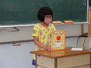 自分の好きな本(ジャンルは問いません)を聞き手が読んでみたいと思わせる事を競いますが、話しすぎてもあらすじがわかってしまい、言葉が足りなくて面白さが伝わりにくい等、簡単そうで難しいものです。しかし、自分の好きな本を紹介する姿は表現力豊かに手振り身振りも加わり、自信あふれる言葉遣いや態度はとても面白く充実した昼休みとなりました。代表の児童生徒の写真を掲載します。