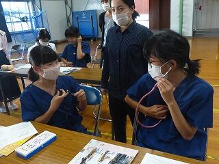 三川内小中学校では、小中一貫校の特徴として、中学部の先生が小学生へ専門性を活かした授業を行っています。