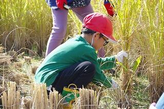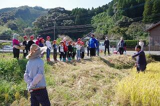 初めに、鎌を使って稲を刈り取る方法を教えていただき、その後、縦割りグループに分かれて刈っていきました。