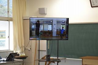 目の前にいる6年生がテレビ画面に映ると、1年生は初め、不思議そうな顔をしていました。また、狂言ですので、下学年の子には内容がわかりにくかったと思うのですが、6年生の素晴らしい表現力で雰囲気が十分に伝わったようで、笑い声が聞こえてきました。