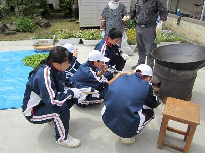 梅木地区地域の方々たちと講師の戸高久文様が参加され、子どもたちも楽しそうにお茶摘み、お茶づくりに取り組んでいました。