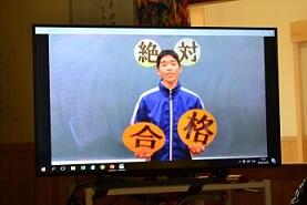 次に、1・2年生と教頭先生からのビデオレターを視聴、最後にみんなで歌を歌い、さらに、2年生が修学旅行先の北野天満宮で買ってきてくれたお守りのプレゼントがありました。