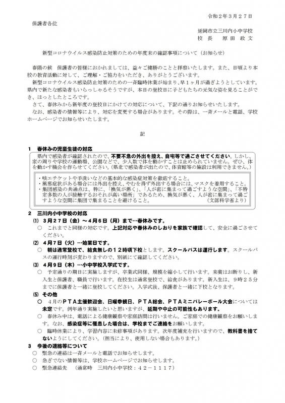 それに伴い、三川内小中学校からも、春休みから令和2年度当初の対応についての文書を下記の通り配付いたしました。