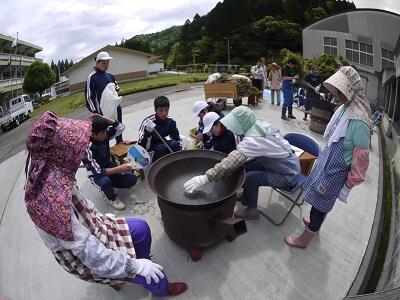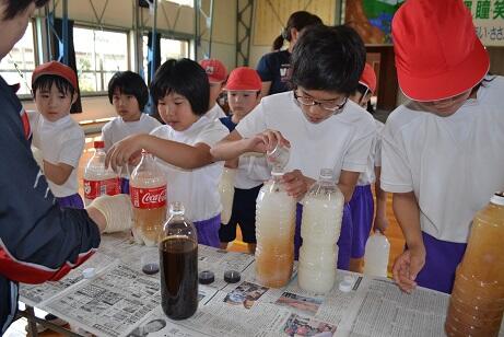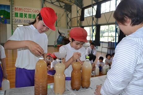 小学部では、地域の方の協力をいただいて、使用前のプールに投入することで河川の浄化に役立てるため、EM菌を作成しています。